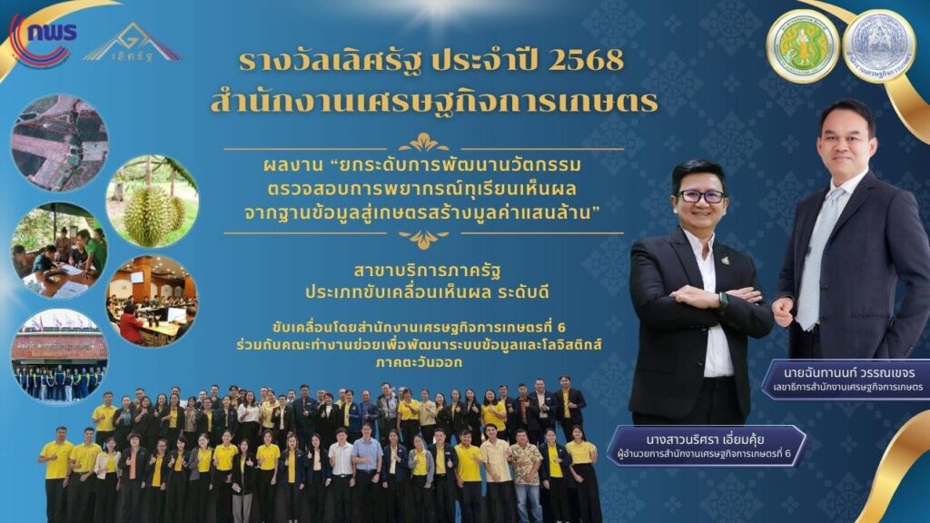 สำนักงานเศรษฐกิจการเกษตร เข้ารับรางวัลเลิศรัฐ ประจำปี 2568 ในงานเสวนาวิชาการและพิธีมอบรางวัลเลิศรัฐ ประจำปี 2568 ภายใต้แนวคิด “ภาครัฐอัจฉริยะ ขับเคลื่อนอนาคต” (Smart Government & Smart Services: Driving for the Future) โดยสำนักงานเศรษฐกิจการเกษตรได้รับรางวัลเลิศรัฐ จำนวน 2 รางวัล