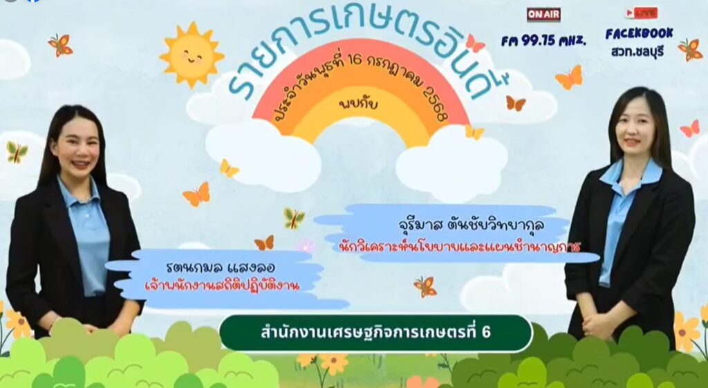 ข่าวประชาสัมพันธ์นางสาวจุรีมาส ตันชัยวิทยากุล นักวิเคราะห์นโยบายและแผนชำนาญการ และนางสาวรตนกมล แสงลอ เจ้าพนักงานสถิติชำนาญงาน ดำเนินรายการเกษตรอินดี้ ออกอากาศทางสถานีวิทยุกระจายเสียงแห่งประเทศไทยจังหวัดชลบุรี